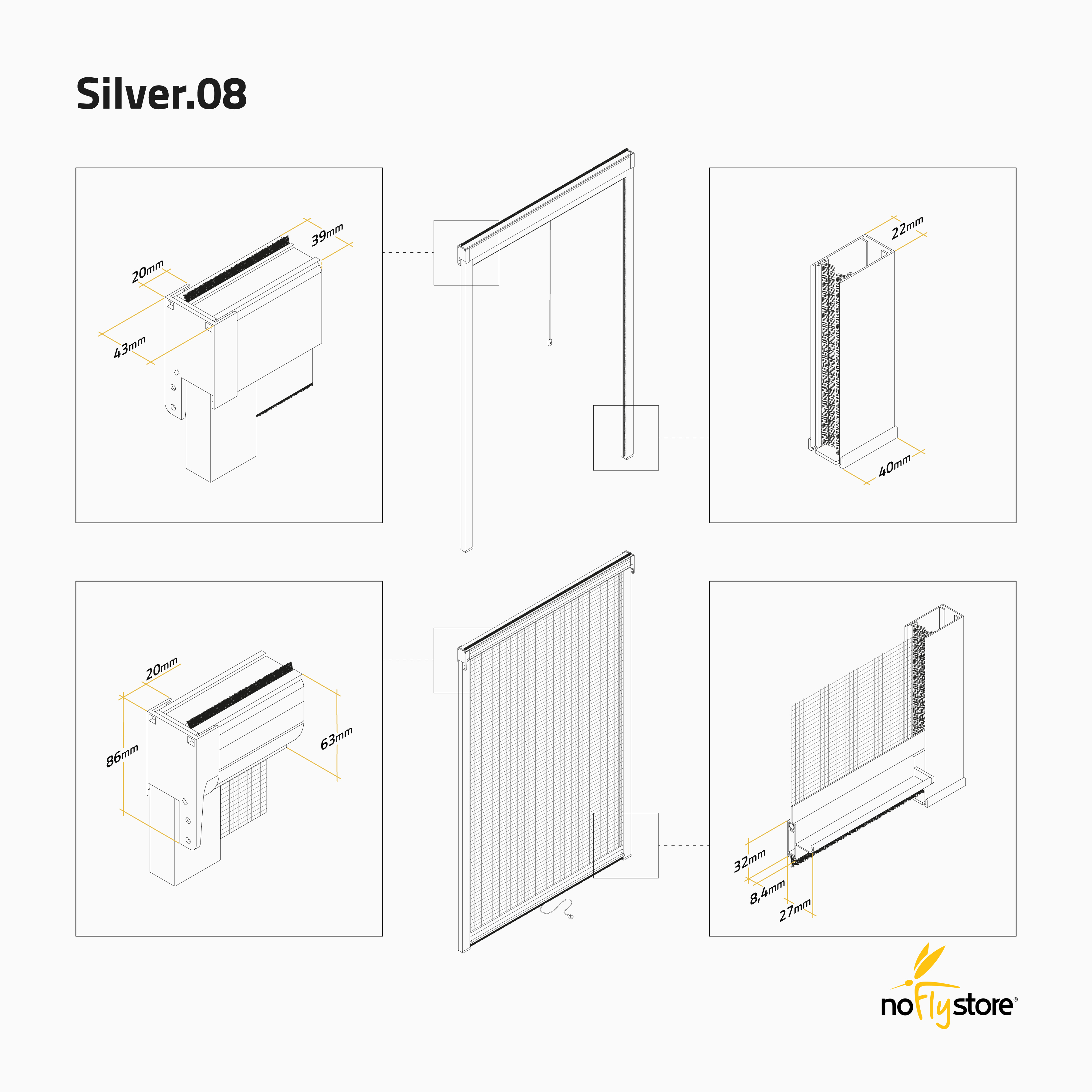 SILVER.08 es una mosquitera enrollable vertical concebida para integrarse de manera discreta en el hueco de la ventana. Su estructura simple y lineal la hace apta para cualquier ambiente doméstico y ofrece una solución práctica para la protección diaria de la ventana sin recargar su estética.